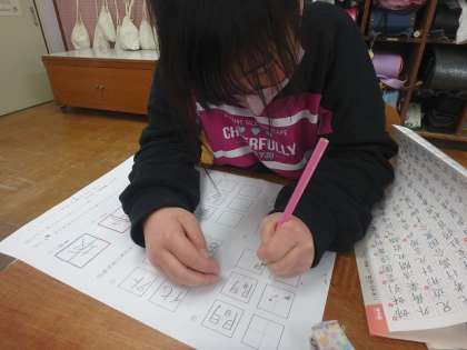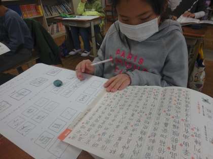 硬筆の学習で漢字の組み立てについて考えました。たくさんの漢字を組み立て方に分け,どのようなバランスで書けばよいのかを話し合いました。