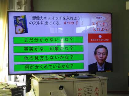 「想像力のスイッチを入れよう」の学習が終わり,その発展学習として,実際に筆者の下村健一さんが「新型コロナ」に関することで想像力のスイッチを入れて考えようというお話をされている映像をみんなで見ました。