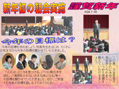 冬休みがあけ、新年初の朝会です。今年の目標を決めて、この1年を着実に進めていきましょう。