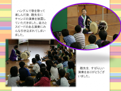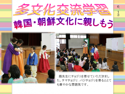 2・3年生が多文化共生学習の一環として,趙先生をお招きしてハングル語の学習から始め,チョゴリ体験,チャンゴの演奏を体験しました。
