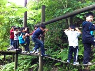 山の家にはスリル満点のフィールドアスレチックがあります。これまでみんなが協力して時間短縮を頑張り,余裕の時間を作ってきたので,今朝のご褒美,アスレチックを楽しむ時間ができました。「ヤッター」大歓声の中,楽しい時間を過ごすことができました。「明日もやりた〜い」