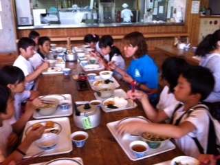 花脊山の家「食堂」でいただく食事も思い出のひとつです。今回は,今日の昼ご飯を紹介します。カレーライス・ビビンバ丼・うどんのメインから1つ選びます。そして,おかずやサラダはバイキング方式でいただきます。どうです,嬉しそうな顔が並んでいますね。