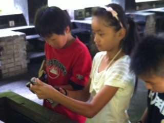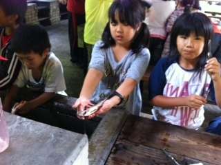 朝の活動で捕まえた魚を塩でしめておきました。さあ,おいしくいただくために内臓を取り出してから血合いを取って塩をふりかけます。その後,串にさして,焼く前の準備は完了です。