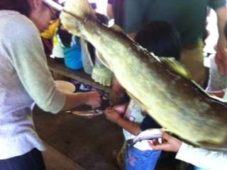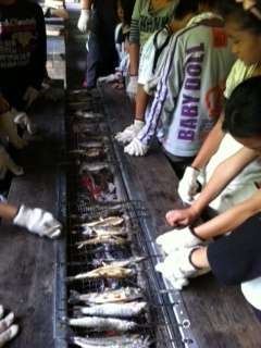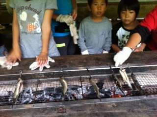 炭火で串に刺した魚を焼きました。香ばしくてほくほくです。かぶりついていただきました。魚の「命」に感謝。