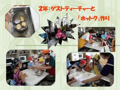 2年生が地域のゲストティーチャー(今回は保護者)の方から韓国のお菓子「ホットク」作りを教わり,実際にみんなで作りました。この授業は,小栗栖小学校で「いろんな違いを認め合うことの大切さ」を学習している中で,小栗栖小学校の友だちに関係のある国を取り上げています。