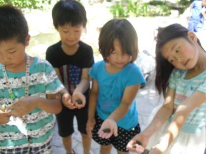 中庭には,カエルやメダカをさがして捕まえて観察する子ども達がたくさんいます。水に手を入れて捕まえようとしても,すぐに逃げてしまいます。こつをつかんでうまく捕まえる子ども達もいます。