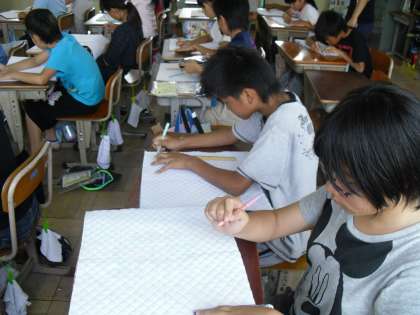 家庭科の学習で,「ナップサック」を作ります。栄養教諭の先生にも教えてもらってしるしをつけて,縫っていきます。野外宿泊活動までに完成することを目標にがんばっています。