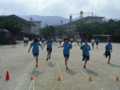 軽いランニングっとストレッチをした後,もも上げなどのアップをして,トラックを走ります。暑い日が続きますが,子ども達は笑顔で生き生きとがんばっています。