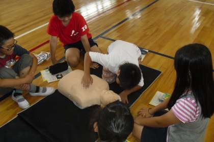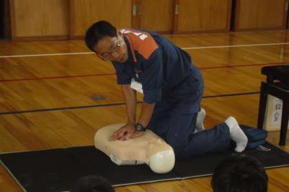 心肺蘇生法のやり方を教えていただいた後,グループに分かれて実際に人形を使って一人一人が行いました。