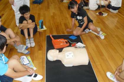 心肺蘇生法の次は,AEDの使い方を教えていただきました。AEDは電気ショックを行う機器ですが,音声ガイドに従ってやれば安全に使うことができることが分かりました。