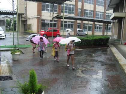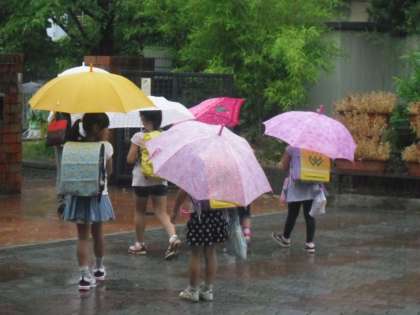 今年は例年になく雨の少ない梅雨でしたが,今日は昼から本格的な雨が降りました。子ども達も天気予報で昼から雨が降ると知っていたのか,みんな傘を持ってきていました。