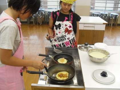 先週,家庭科室に「エアコン」がついたので,涼しく快適な中でホットケーキを焼くことができました。