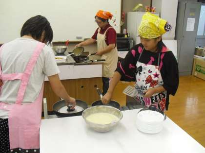少し遅いのですが,日本語教室の「1年生を迎える会」を行いました。高学年の児童が家庭科で学習したことを生かして,栄養教諭の先生にアドバイスをしてもらいながらホットケーキを焼きました。