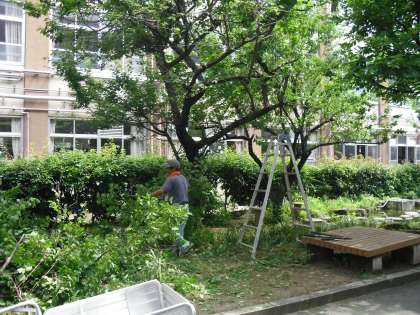 子ども達が大好きな中庭ですが,1年に何度か毛虫が大発生します。風通しが悪いことが原因でもあるそうです。そのため,管理用務員さんに中庭の大きな木の剪定をしていただいています。高いところははしごを使って切ってもらいます。怪我をしないように気をつけてくださいね。