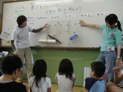 一人一人手でもって重さを比べましたがよく分かりません。そこで,ゴムで作ったはかりを使って調べました。
