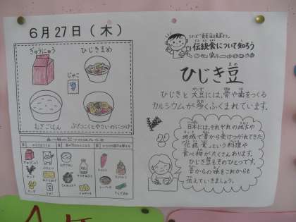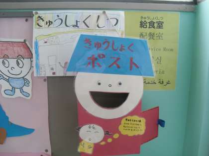 給食室の前に「給食コーナー」があります。栄養教諭の先生が,今日の献立について説明をしたり,給食ポストを置いたりと,とても楽しい掲示をしてくださっています。
