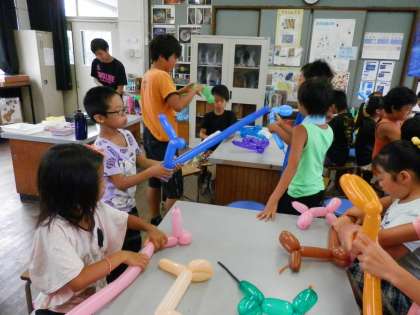 7月30日登校日でした。理科室で3年生といっしょにバルーンアートとヨーヨーつりをしました。はじめに6年生が犬の作り方を覚え,3年生に一つひとつていねいに教えていました。3年生は「とっても楽しかった」と帰っていきました。6年生の優しさ,面倒見のよさを改めて感じました。