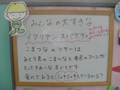 今日は子ども達の大好物,「イタリアンスパゲッティ」です。中には夏においしいズッキーニ,ピーマン,トマトといった野菜がたっぷりと入っています。これらの野菜には体の熱を下げたり,体の疲れを取ったりする働きがあります。