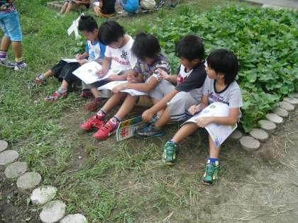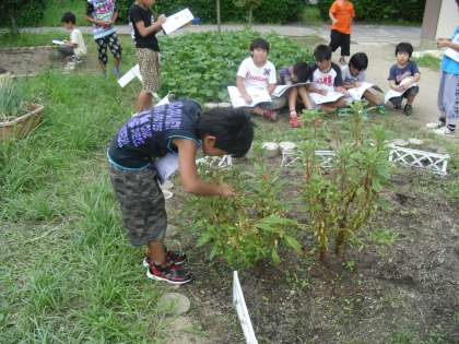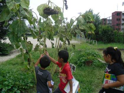 春から育てているヒマワリやホウセンカがどの様に育ってきているかを花壇に行って観察しました。葉や茎,花や実の様子を詳しく調べていました。