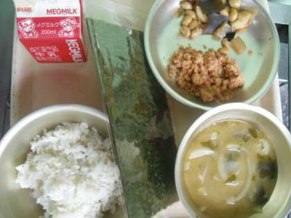 今日の給食は,「みそしる」「ごもくにまめ」「セルフおにぎりのぐ(うめさけ)」「てまきのり」「むぎごはん」「牛乳」です。