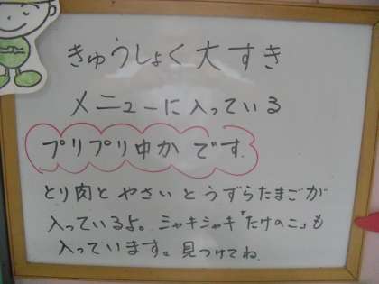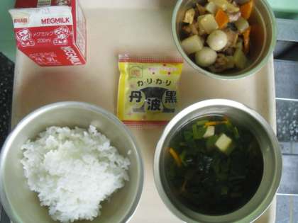 今日の給食は,「プリプリちゅうかいため」「とうふとあおなのスープ」「くろだいず」「ごはん」「牛乳」です。