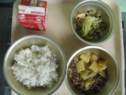 今日の給食は,「にくじゃが」「ごまずに」「むぎごはん」「牛乳」です。