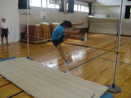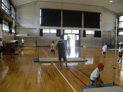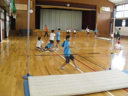 4年生の体育は,体育館で「走り高跳び」を行っています。グループで協力して場の設定をしたり,高跳びのスタンドの高さを変えたりして,一人一人が「はさみ跳び」で自分の記録に挑戦していました。