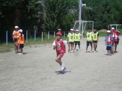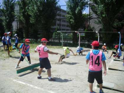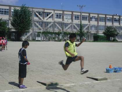 砂場を3つの場に分けて,子ども達は自分の課題に応じた場で練習したり,記録に挑戦したりしています。また,記録係,砂場ならし係,測定係など必要な役割りもしっかりと果たしていました。
