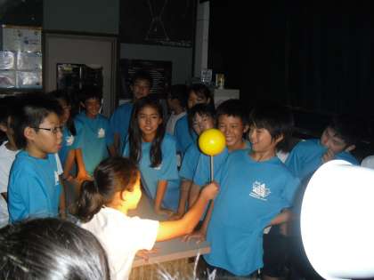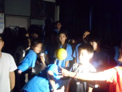 「日が経つと月の形が変化して見えるのはなぜか?」という課題に対して,一人一人が予想を立て,その後,理科室を暗くして,電灯とボールでモデル実験をして確かめました。