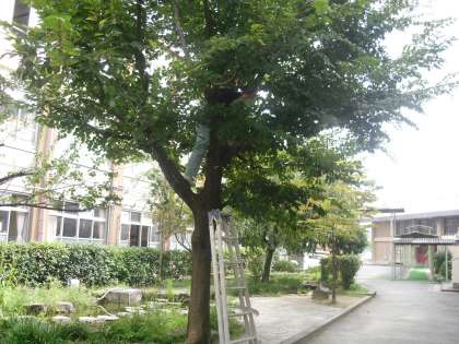 中庭には様々な野鳥がやってきます。中には,巣を作る鳥もいます。そんな鳥たちのために用務員さんが巣箱を木に設置してくれました。