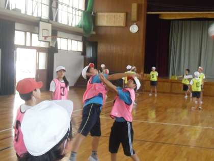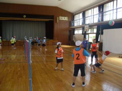 6年生の体育は,「ソフトバレーボール」を行っています。4チームに分かれて,それぞれのチームの良さを生かしていろいろなチームとゲームを楽しんでいます。