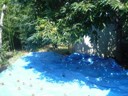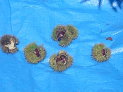 今日もブルーシートの上にたくさんの栗が落ちていました。中には大きくて見事な栗が入っていました。今日まで収穫した栗の数は約150個になりました。あと少しで,全校児童に湯がいた栗を一つずつ配れそうです。