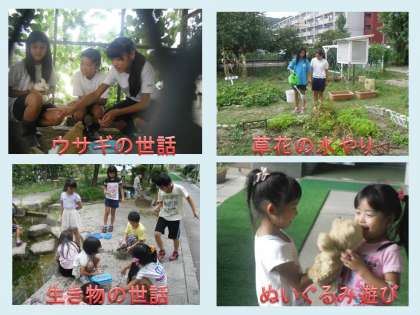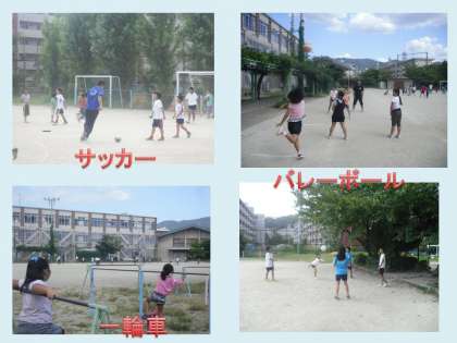 子ども達は,運動場でサッカー,バレーボール,一輪車,総合遊具などで遊んだり,中庭で生き物を見つけたり,ウサギや植物の世話をしたりと,たっぷりと友だちや先生達と一緒に遊んでいます。