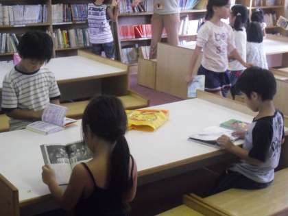 1年生は図書室で読書をしました。図書室の入口のところに上靴をきちんとそろえて並べていました。さすがは1年生ですね。また,図書室の中でも静かに読書をしていました。入学して6ヶ月ですごく成長しましたね。