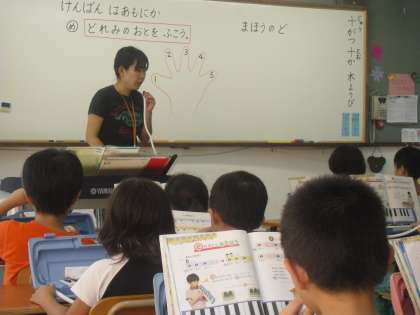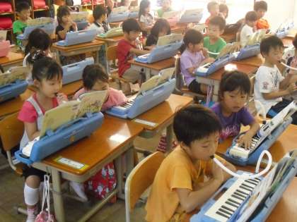 1年生の音楽では,鍵盤ハーモニカの練習をしました。みんなでそろえて演奏したり,隣の友だちの演奏を聴き合ったりしました。
