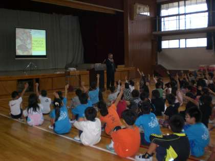 校長先生から,体操で世界選手権4連覇を果たした内村航平選手,ノーベル賞を受賞した山中伸弥教授,毎日朝に走っている本校の5,6年生の写真を紹介され,みんな夢に向かって努力していることを話されました。その後,「うさぎとかめ」の話から,「うさぎ」は,かめを見て走っていたが,「かめ」は,目標だけを見て,一生懸命に努力したという話をされました。