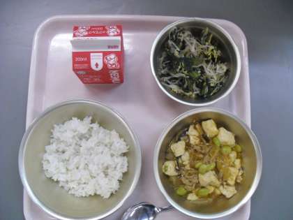 今日の給食は,「とうふのしせんふう」「ほうれんそうともやしのいためナムル」「むぎごはん」「牛乳」でした。