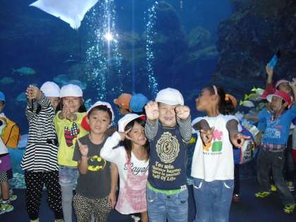 台風26号の影響で心配されていました遠足ですが,1年生と2年生が出発する頃には、雨も上がり青空も広がっていました。水族館では、イルカのショーを見てお弁当を食べた後に班行動で仲良く、お魚の観察も出来ました。本当にお天気にも恵まれて、楽しい1日が過すことが出来ました。
