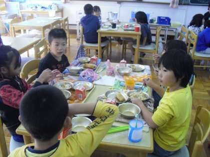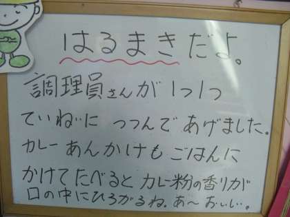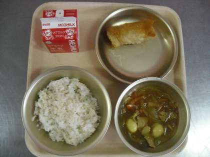 食べ物が持つそのままの味を味わえるように給食では「手作りの味」を大切にしています。今日も,「一つ一つ心を込めて巻かれた春巻」と「手作りルーを使ったカレー」で,安全でおいしい手作り給食を味わって食べました。