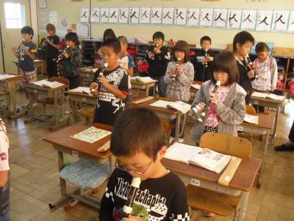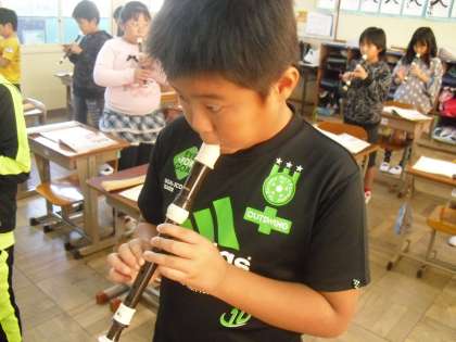 3年生はリコーダーをがんばっています。今日は,「レッツゴーソーレー」という曲をみんなで合奏しました。旋律の動きやリズム,音の重なりを考えながら演奏しました。