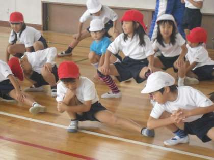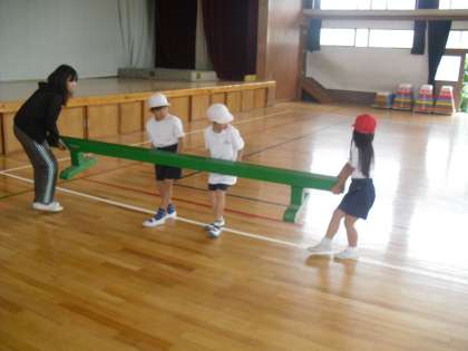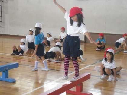 1年生は体育で「へいきんだいあそび」をしています。先生から教えてもらった渡り方や,自分で考えた渡り方に挑戦していました。平均台を運んで場作りをしたり,準備運動をしたり,てきぱきとグループで力を合わせて行っていました。