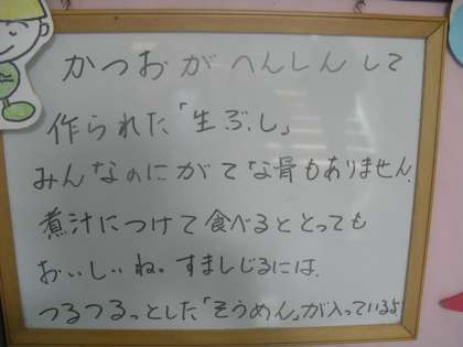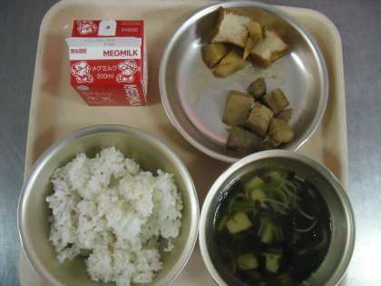 今日の給食は,「すましじる」「なまぶしとあつあげのにつけ」「むぎごはん」「牛乳」でした。