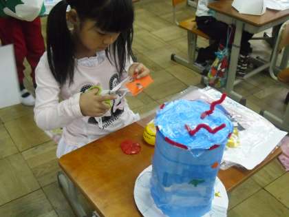2年生は図工で「ぼうしをかぶって」という工作を行っています。色紙を切ったり貼ったりして自分だけのぼうしを作っています。もうできあがってきたぼうしもありました。