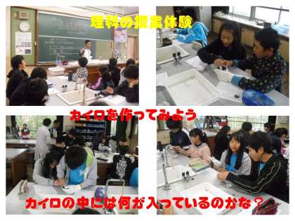 本校の6年生は,理科の授業体験を行いました。授業のテーマは「カイロを作ろう」で,鉄と炭を乳鉢で混ぜ合わせると熱が発生し温度が上がるという実験をしました。二人組で実験をし,中には60度を超える温度まで上がったグループもありました。