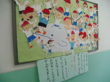 1年生の掲示板には,国語で学習した「くじらぐも」の作品が掲示しています。くじらぐもにのった子ども達はどんなことをお話ししたのかを考えました。