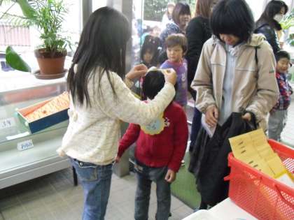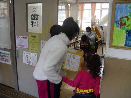 来年度入学する新1年生を対象に,「就学時健康診断」を行いました。受付を済ませると5年生が名前の書いた飾りを付けてあげて,手をつないで健康診断の場所を案内してくれました。
