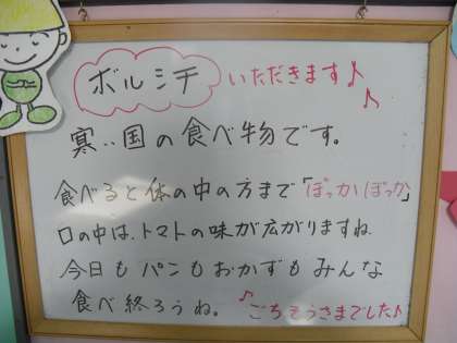 今日の給食は,「ボルシチ」「こまつなのソテー」「あじつけコッペパン」「牛乳」でした。