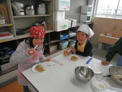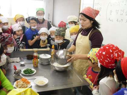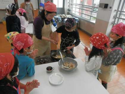 総合的な学習の時間に多文化の学習として,チヂミづくりをしました。姜さんにゲストティーチャーとしてお越しいただき,おいしいチヂミの作り方を目の前で教えていただきました。子どもたちは,一人ひとりチヂミづくりに挑戦し,あつあつをホクホクとたべていました。最後にはハングルで「おいしい」と,たくさんの子が感想を言っていました。