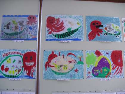 1年生の教室に図工の時間に描いた「おはなしの絵」が掲示されています。「モリくんのすいかカー」というお話しを聞いて想像した場面を絵にしました。