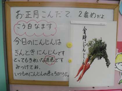 お正月の食べ物「紅白なます」は,金時にんじんの赤い色とだいこんの白い色で,お正月の「めでたさ」を表しています。
